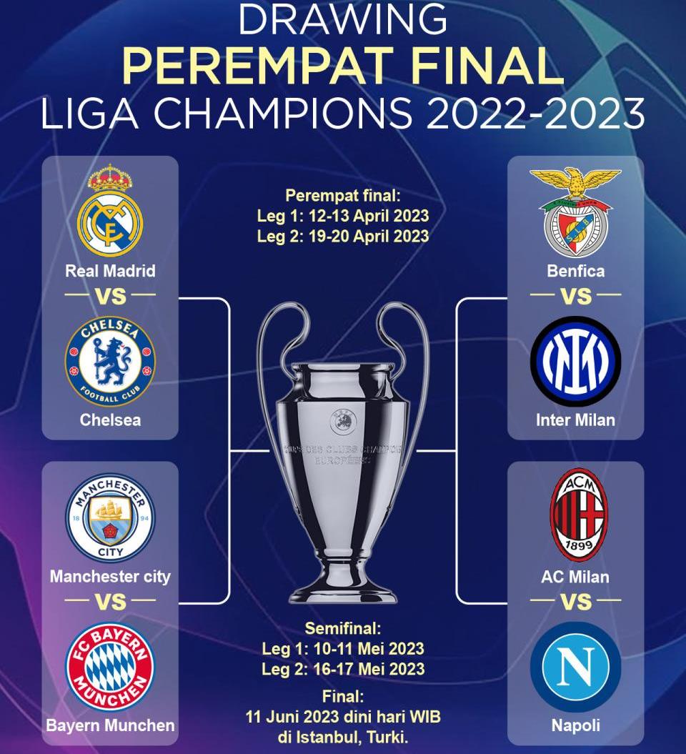 Dalam drawing yang digelar di markas UEFA, Nyon, Jumat (17/3/2023) sore, Manchester City bertemu Bayern Munchen di babak perempat final Liga Champions.Big match lainnya akan mempertemukan tim satu negara, yakni AC Milan vs Napoli. Sementara satu perempat final lainnya mempertemukan Inter Milan vs Benfica.