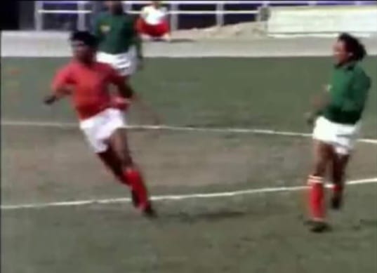 Rusdy Bahalwan dan memberikan umpan silang kepada Zulkarnaen Pasaribu yang berdiri di sisi kanan Subodro.