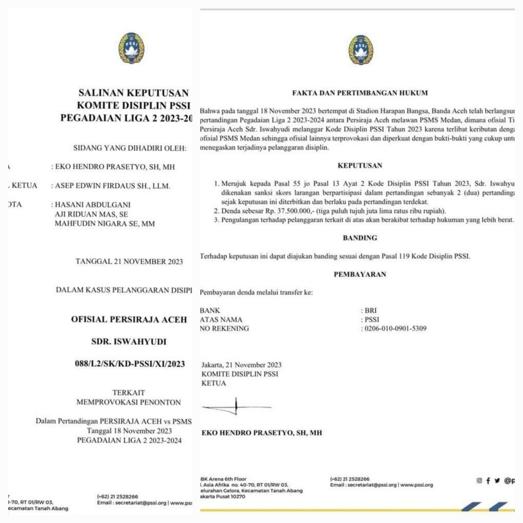 “Bahwa pada tanggal 18 November 2023 bertempat di Stadion Harapan Bangsa, Banda Aceh telah berlangsung pertandingan Pegadaian Liga 2 2023-2024 antara Persiraja Aceh melawan PSMS Medan, dimana ofisial Tim Persiraja Aceh Sdr. Iswahyudi melanggar Kode Disiplin PSSI Tahun 2023 karena terlibat keributan dengan ofisial PSMS Medan sehingga ofisial lainnya terprovokasi dan diperkuat dengan bukti-bukti yang cukup untuk menegaskan terjadinya pelanggaran disiplin,” demikian kutipan Keputusan Komite Disiplin PSSI Pegadaian Liga 2 2023/2024 itu.