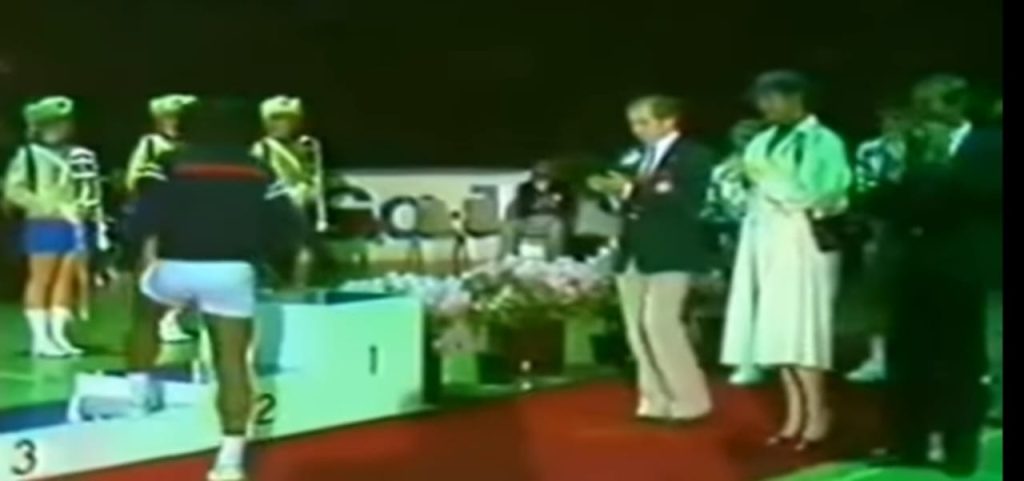 Icuk Sugiarto naik ke podium Juara Kejuaraan Dunia 1983 diiringi tepuk tangan dari Ratu Margrethe II,Presiden IOC Juan Antonio Samaranch dan Presiden IBF Craig Reedie