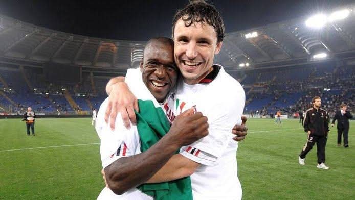 Mark Van Bommel bersama rekan senegaranya Clarence Seedorf merayakan kesuksesan AC Milan meraih Juara Liga Italia musim 2010/2011